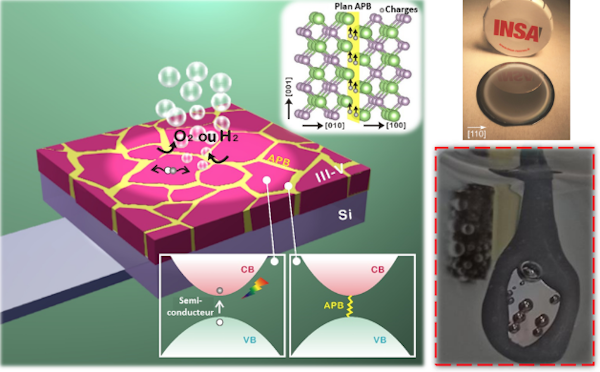 Notre travail montre donc que la présence de parois d’antiphase (l’acronyme anglais « APB » est utilisé sur l’illustration), qui sont des défauts cristallins bien spécifiques inversant localement l’arrangement des atomes, dans les matériaux III-V déposés sur silicium, leur confère des propriétés physiques tout à fait remarquables et sans précédent. En particulier, nous montrons que ces parois se comportent localement (à l’échelle atomique) comme des inclusions métalliques, dans un matériau qui est, lui, semi-conducteur.